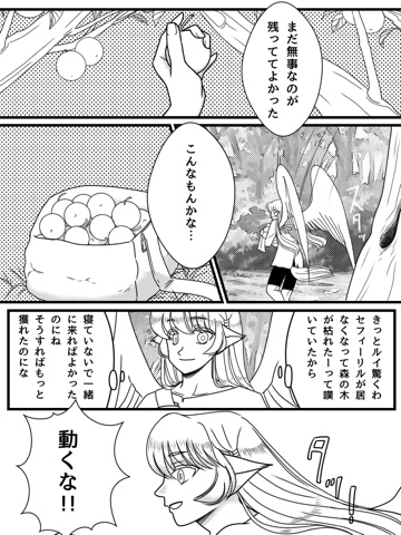 レライデルより速くファリエミルに到着した二人はセフィーリルが居なくなったことによって枯れ果た森の草木を目にし、ルイは落胆、リリーは一人森の中に入り食べ物となる木の実を探します。